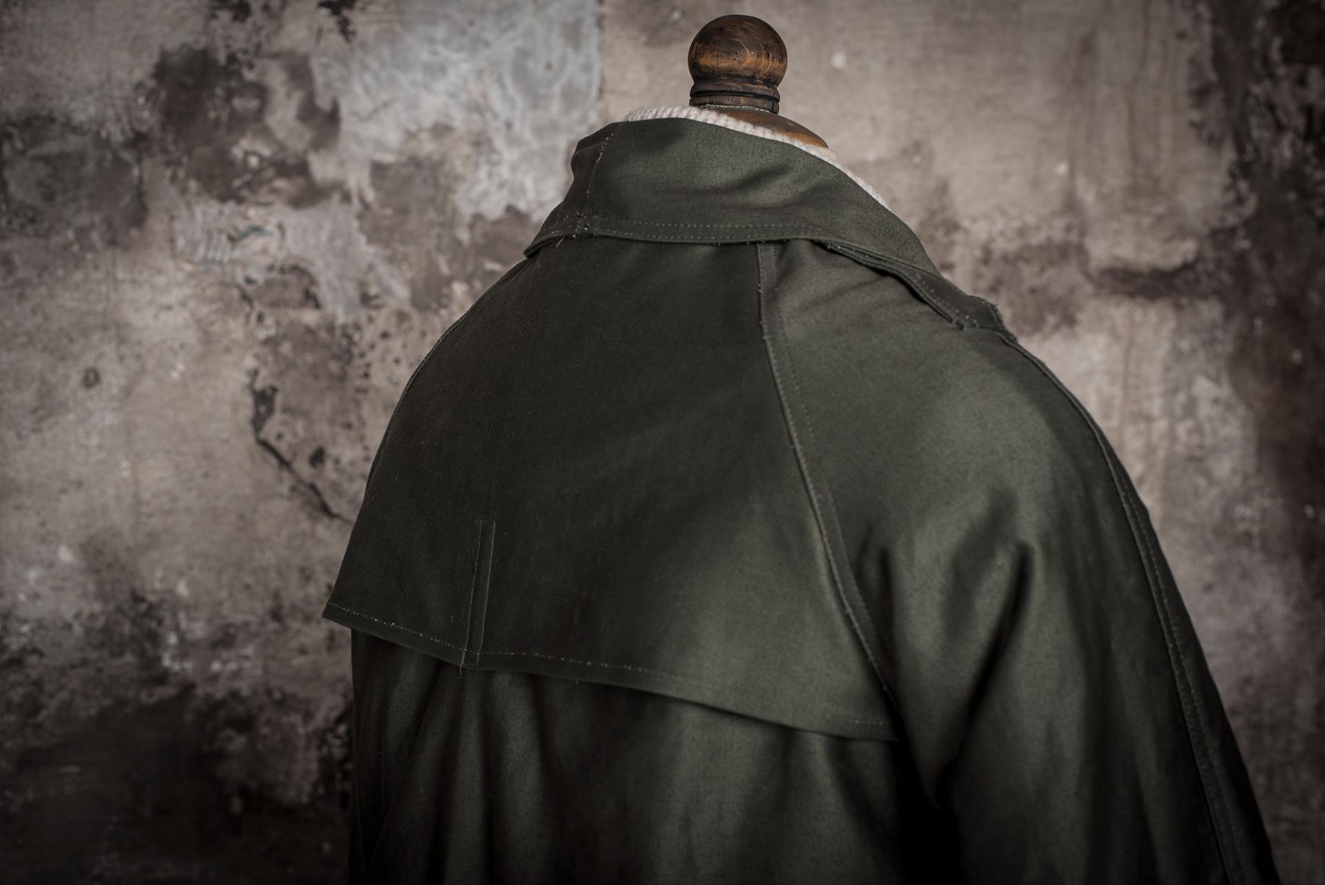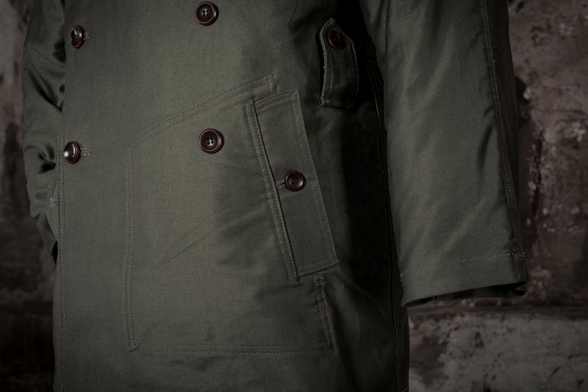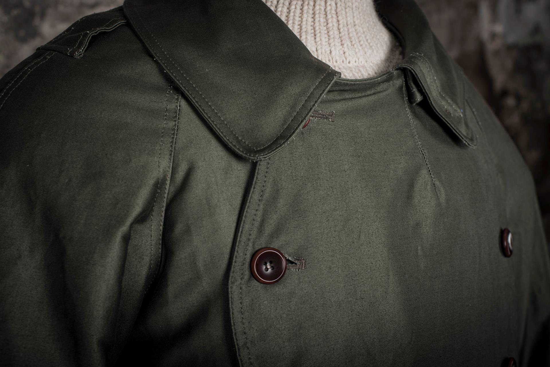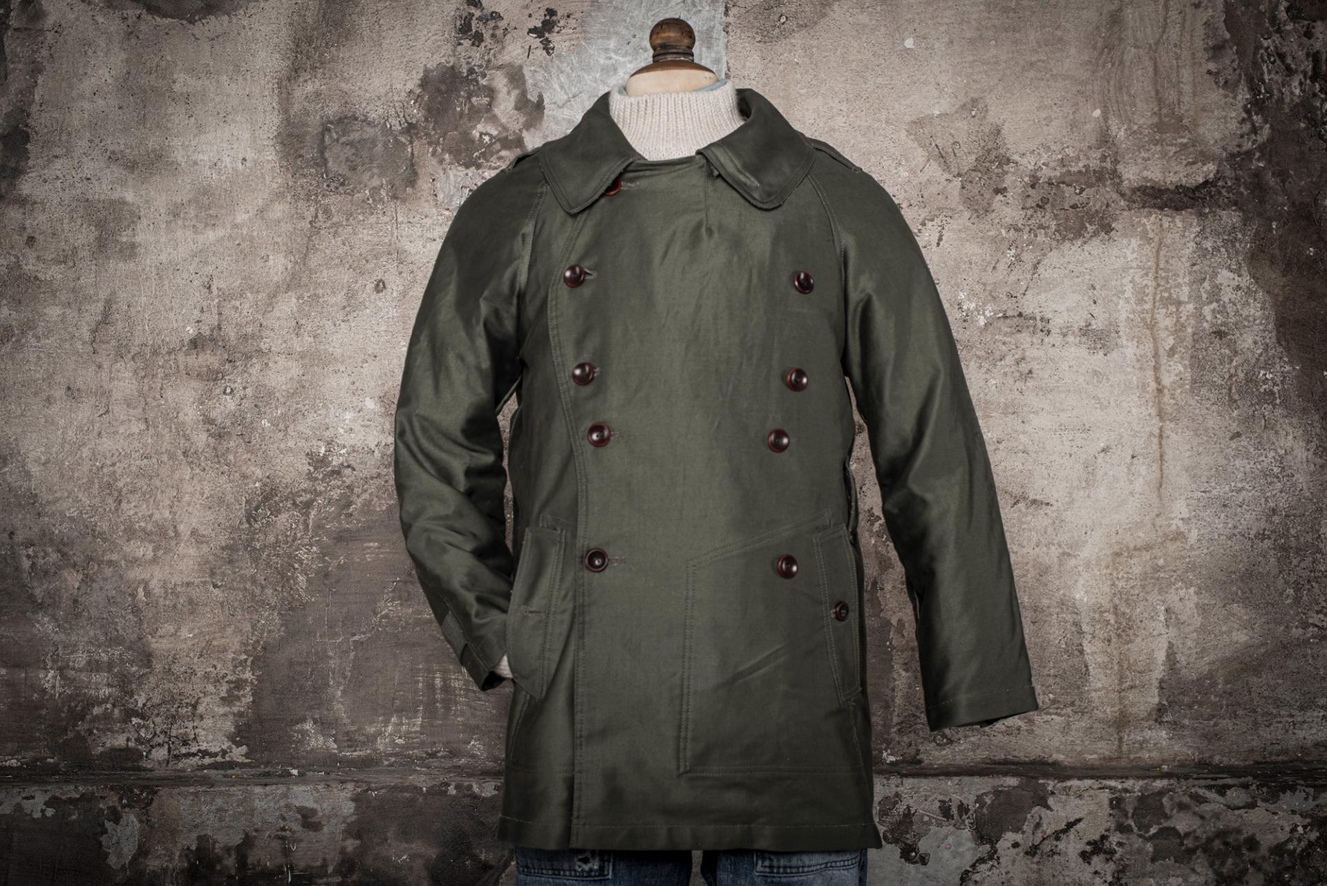 Ce paletot, en grosse toile de coton Moleskine Kaki est inspiré d’ un modèle 1938, spécialement conçu pour les motocyclistes de l'Armée Française.